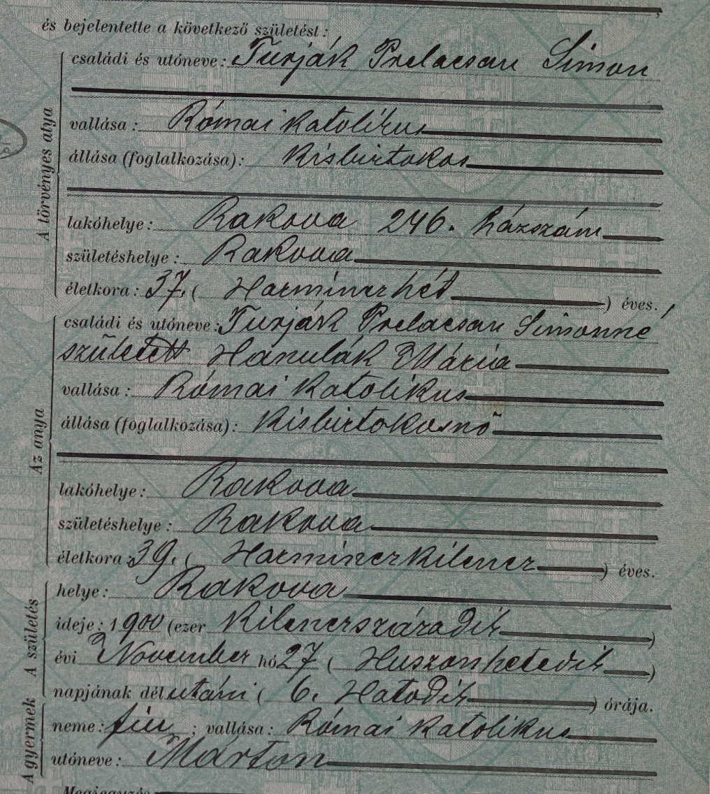 - manžel Šimon Preľačan (uvedený otec Sim., čo chápem ako Šimon, rok narodenia 1862, všetko sedí) Chýba síce časť mena Turák, ale v matrike pri krste detí je uvedený Turjak-Prelacsan)