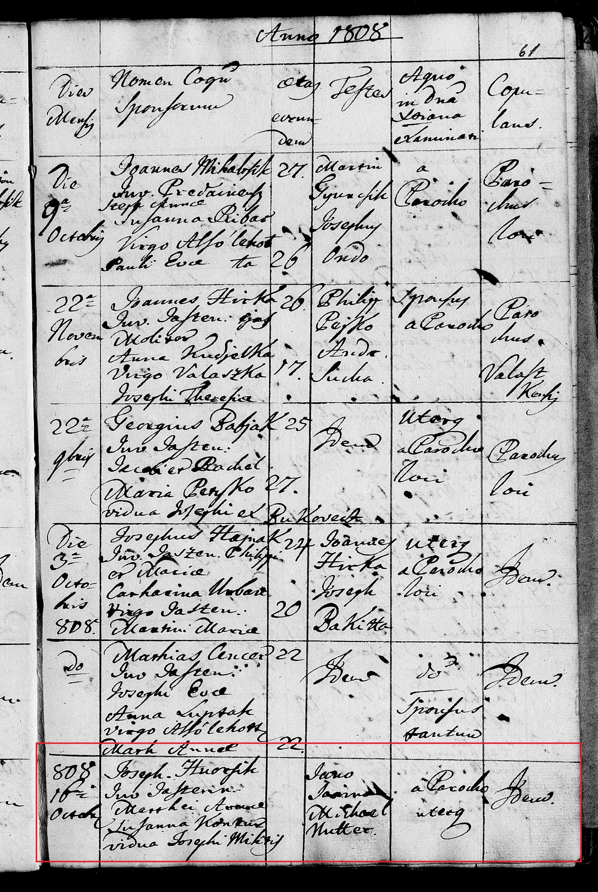 - skúste zadať vo vyhľadávaní danej farnosti narodenie dieťaťa kde je matkou Zuzana (skúste aj latinsky *Su* - nájde verzie Susana, Susanna, Zsuszana) a otec Joseph* a časové rozmedzie dajte od 1790-1808 a pozrite, či sa tam niekto narodil tomu páru a uvidíte meno otca, bude podobné tomu Mikzisovi. Ak nenájdete žiadne dieťa, otvorte si knihu úmrtí a prezrite úmrtia Jozefov s podobným priezvisko dva týždne pred sobášom až do obdobia 5 rokov dozadu (teda 1803-september 1808).