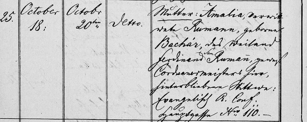 v origináli: „Mutter: Amalia, verwittwete Rumann, geboren Bachár, des Weiland Ferdinand Sam(uel). Rumann, geweß(en) Corduanermeister hier, hinterbliebene Wittwe Ewangelisch A(ugustanae). Conf(essionis) Hauptgasse N(ume)ro 110.“