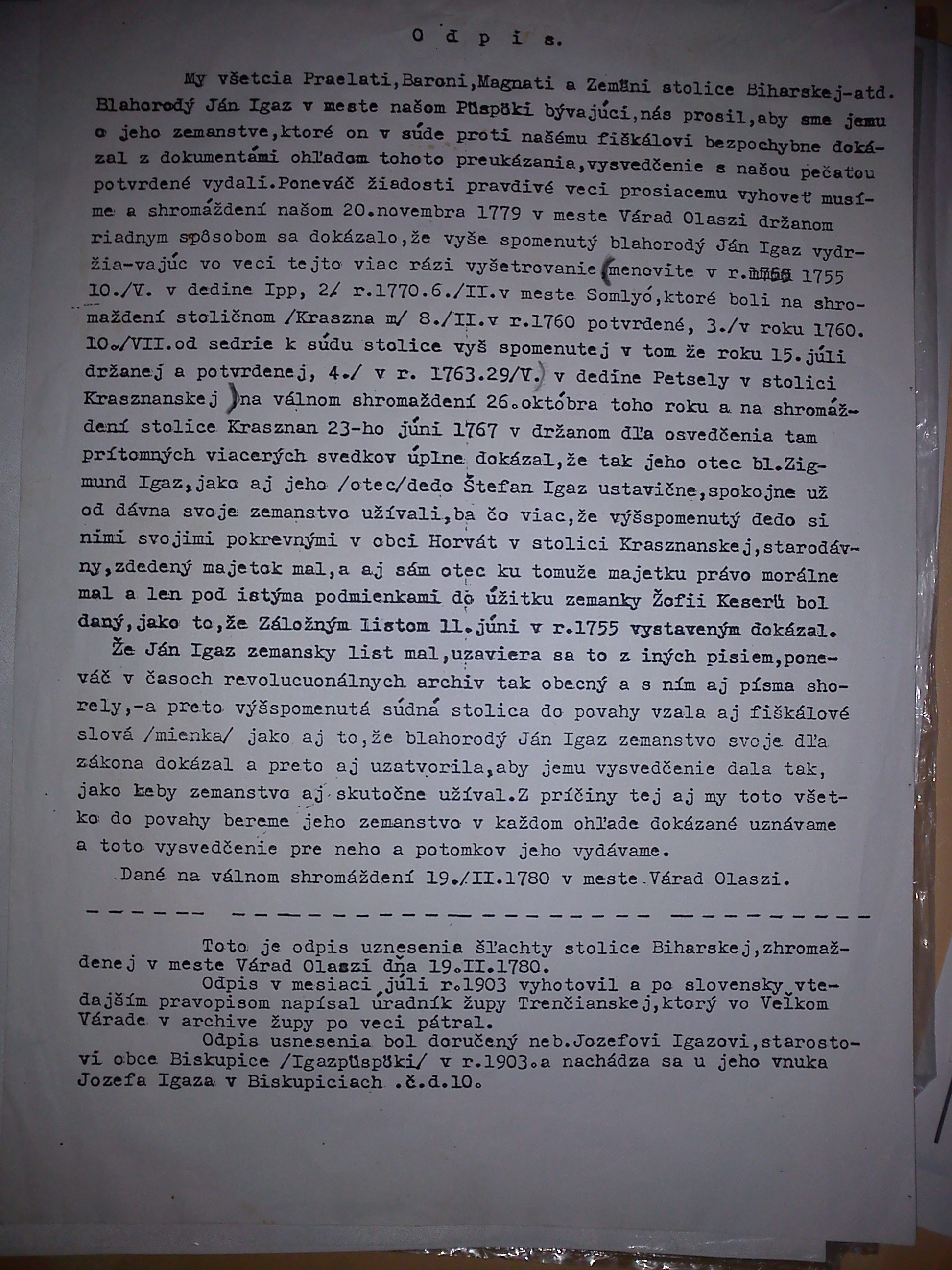 V odpise uvedenej listiny, ktorý uvádzate, sa uvádza mesto Puspoki v Biharskej stolici (ako som uviedol vyššie pôvod jednej vetvy Igazovcov). Listina bola vydaná v r. 1780 a dokladuje iba to, že Igazovci v Biharskej stolici majú zemiansky pôvod. Listina nemá žiaden súvis s Biskupicami pri Bánovciach.