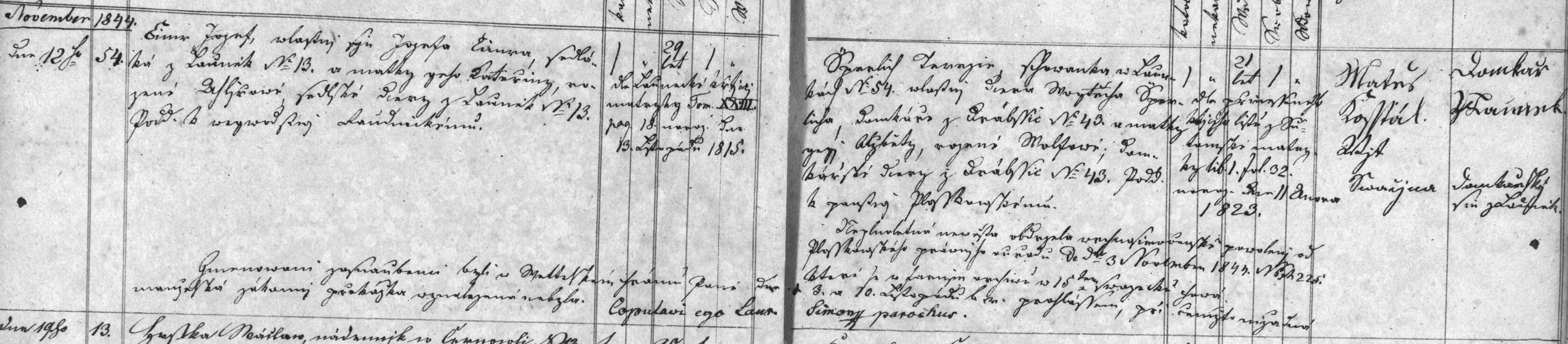 Ženích: Cimr Jozef, vlastní syn Jozefa Cimra, sedláka v Lounkách 13 a matky XXX Kateřiny rozené XXX v Lounkách 13 XXX