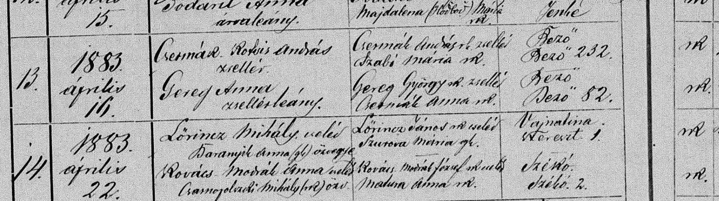 No, včera jsem zjistila, že rodiče u Anny jsou András Csermák, ale Marie Szák.... Otec Andráse, také András, měl za ženu Máriu Szabó. Jejich sňatek jsem nenašla, bylo to asi jen shoda jmen a špatný odhad...takže nemám nic....ani jejich další děti...už hledám v matrikách 3 den, stránku po stránce a nic:-( Ale určitě žili v Bežovcích a byli římskokatolíci. Ale András zemřel 1914 v Bežovcích v 58 letech. A u jména měl přezdívku Kotcis, může to něco znamenat?