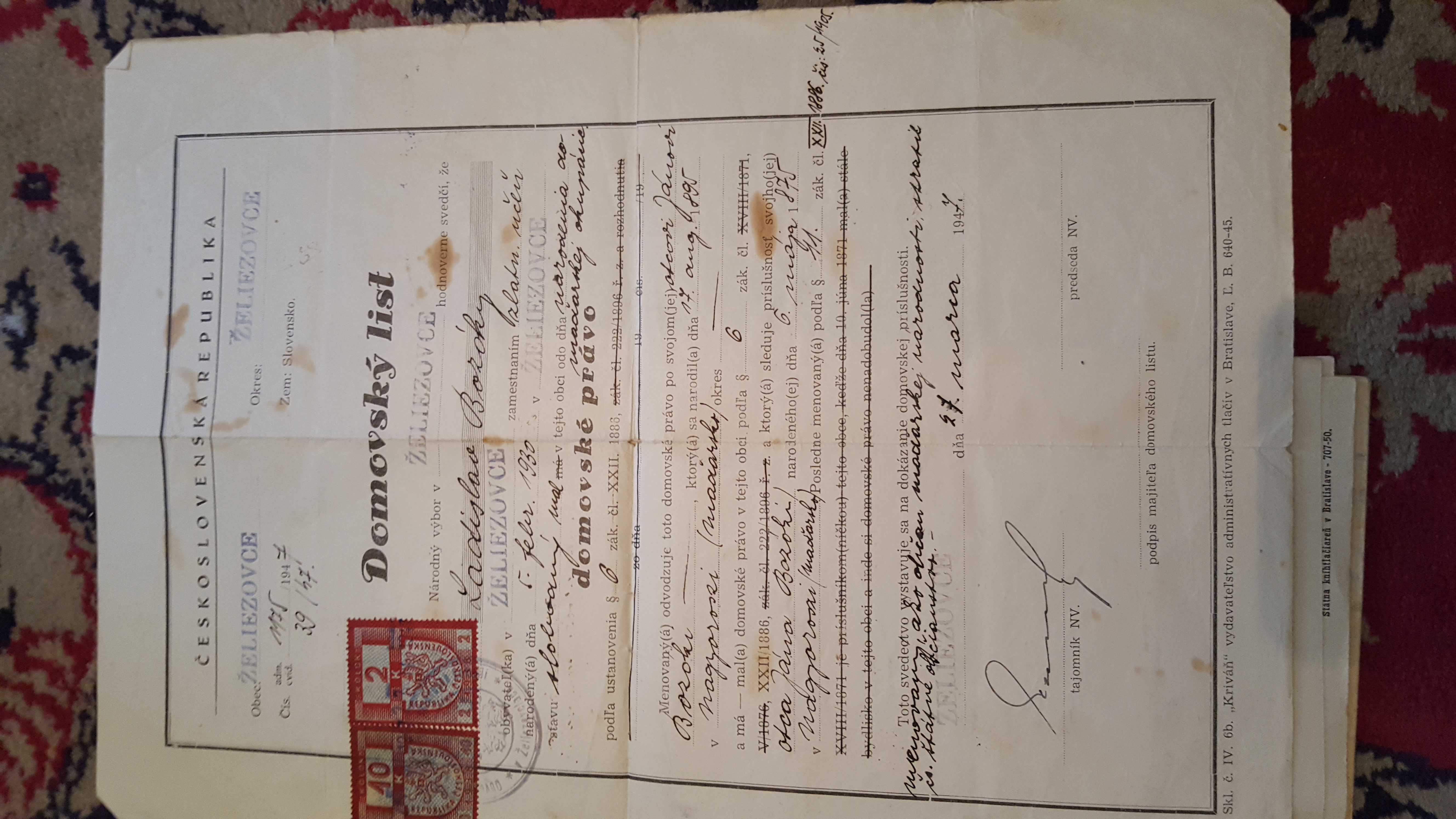 Pripajam domovsky list mojho stareho otca (Ladislav) z roku 1947. Spominaju sa tam mena aj datumy narodenia jeho otca a stareho otca (obaja Janovia).