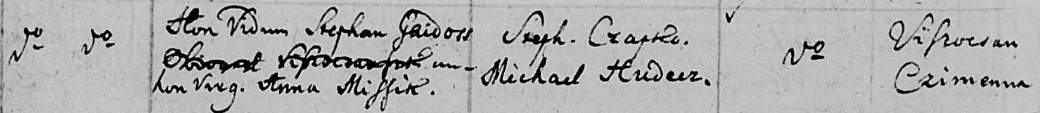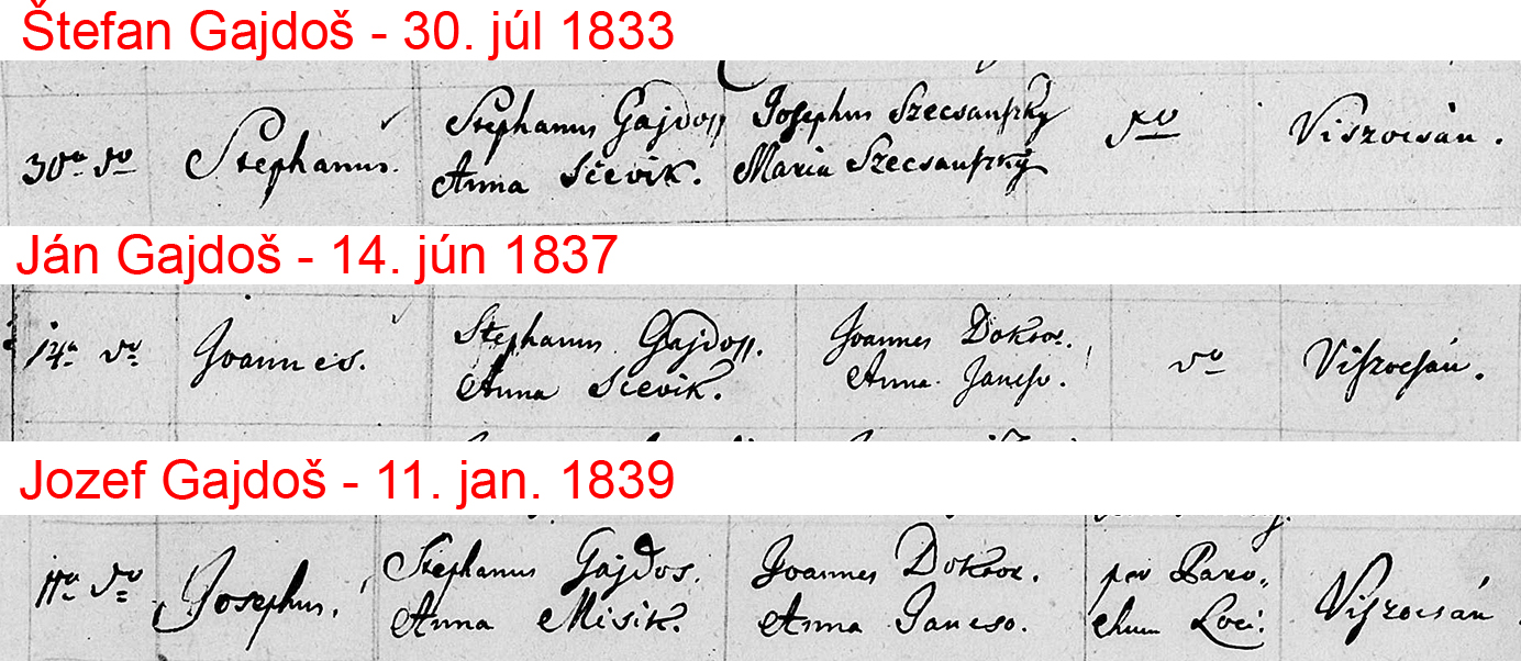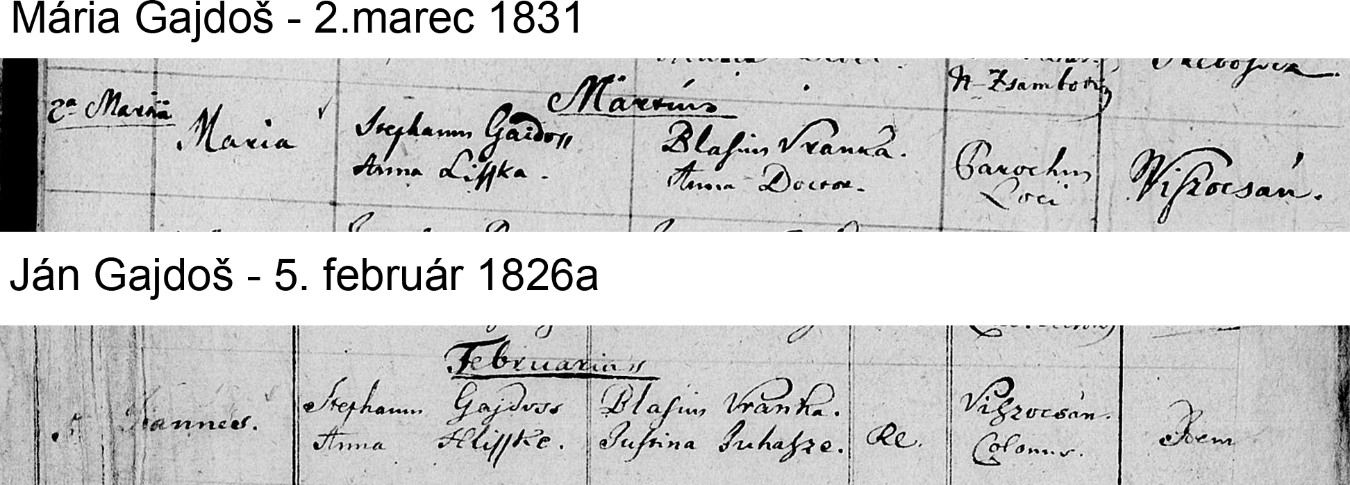 Pri svadbe Štefana Gajdoša a Anny Mišík je uvedené, že Štefan je vdovec. Pozeral som teda narodenia detí Štefana Gajdoša vo Vysočanoch pred rokom 1831, kedy sa druhý krát oženil a našiel som toto: Teda zase očividný problém s prepisom mien kedy farár raz napísal Anna Líška a raz Anna Hlíške - tento raz som si však istý že ide o tú istú osobu. Hladal som ďalej svadbu osôb Štefan Gajdoš a Anna Líška...nič a aby v tom bol ešte väčší chaos, našiel som toto : Svadbu osôb menon Štefajn Gajdoš a Anna Pozvan (Porvan) ? 16. novembra 1823 vo Vysočanoch...niekto tu mal očividne problém s vlastnou identitou