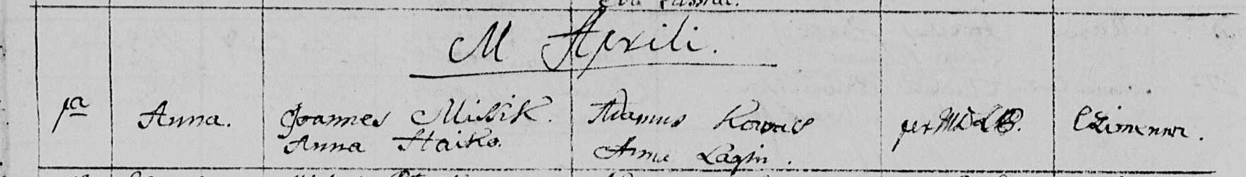 Anna Mišík narodená 1. apríla 1810 (strana 504) Jánovi Mišíkovi a Anne Haiko, krstný rodičia Adam Kováč ? a Anna Lagin. No múdrejší niesom...